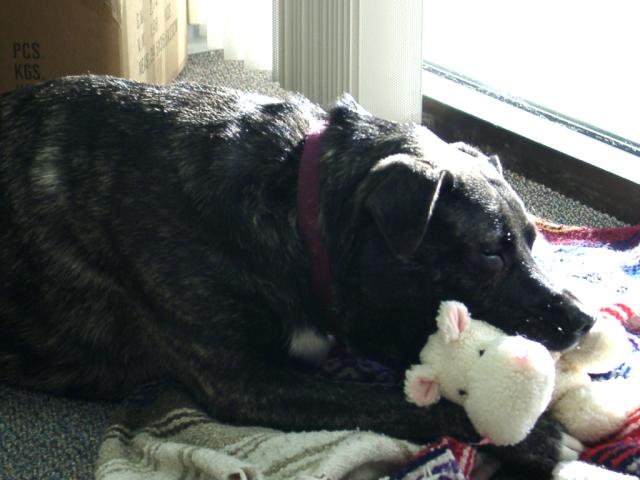 Well as of 10-13-2002, there is a new, smarter furrier halfbrainboy. His name is Guinness and he is pictured below. He is an amazing dog, and very wonderful. Just in case you are curious he is a black lab / pitbull mix. He proved his abilities the first night by almost clearing out the room with his gas.