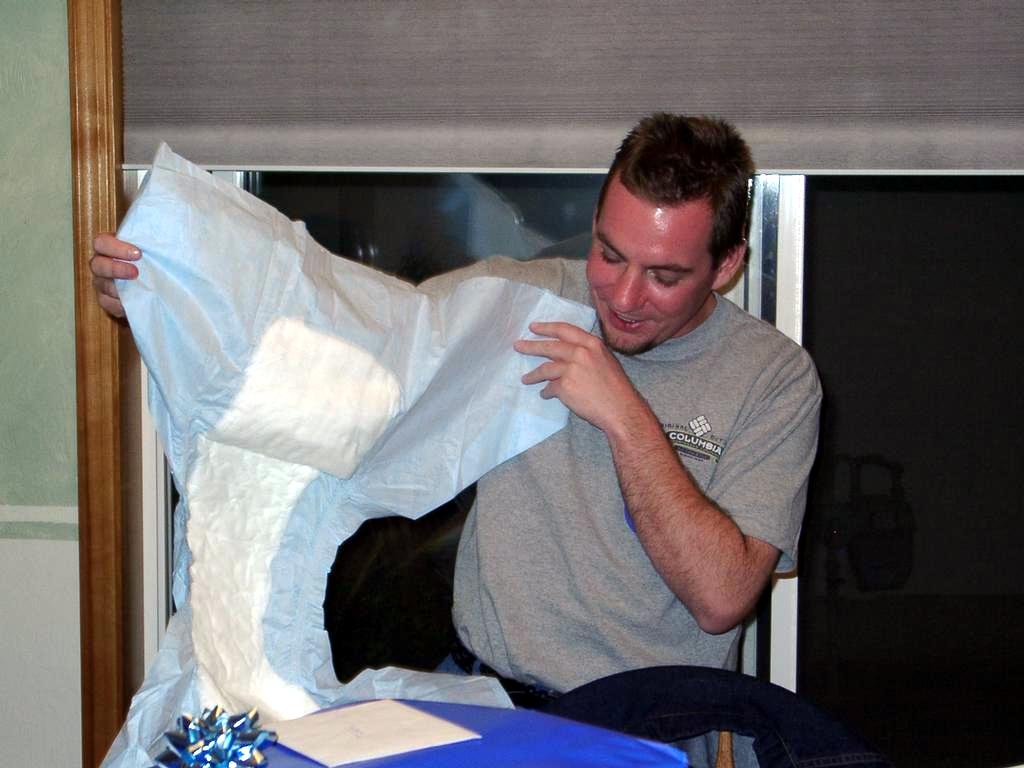 Well here is the best gift of all. After Scott put this on, he only had to go to the bathroom every hour instead of every 15 minutes. Bernadette told us it could hold a whole liter, something that made Scotts eyes light up. |