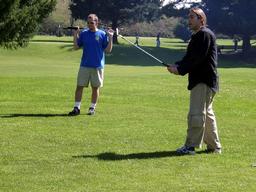 Finally after much goofing around we settled down. Here Scott watches Jeff put a nice shot onto the green. |