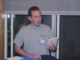 After way too much food, presents were given and Scott had to get ready for a really long night. Here he is reading a card. |